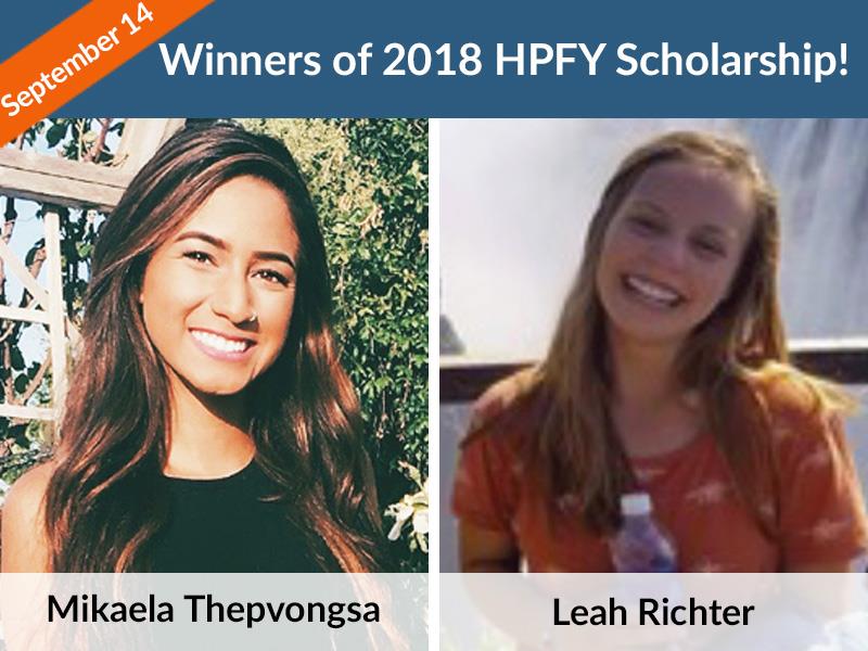 Mikaela Thepvongsa and Leah Richter Mikaela, the winner of our HPFY Disability Scholarship, has proven grit and determination can overcome any disability. She has bilateral profound hearing loss and a vestibular disorder due to a diagnosis of static encephalopathy in early childhood. Leah, the winner of our HPFY Make a Difference Scholarship, is making a big difference in the lives of countless under privileged children in US and the world. She has over a 1000 volunteer hours in the last two years. Her mission in life is to help homeless children across the world.