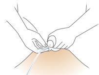 If cathing while lying down, use an underpad. Knees can be straight or bent. If sitting on the toilet, spread your legs apart. Once in position, arrange clothing out of the way.