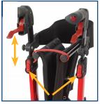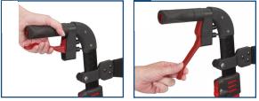 Press the red release buttons for the handgrips below, as shown in the figure, and pull the handgrip upwards at the same time. As the handle moves, release the button. This automatically locks in the next possible height. Repeat this process until the desired height is reached.