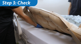 To check for proper inflation, slide your hand between the overlay and support surface, under the patient's iliac crest area. Your hand should notice approximately 1/2 inch to 1 inch of air. If there is more than 1 inch of air, remove air by tapping the clear valve. If your hand does not slide easily beneath the patient, add air.