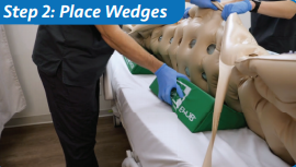 Place the first position perfect wedge just above the waist area and the second just below the hip area, one hand-width apart, to offload the sacrum. Return the patient down onto the wedges