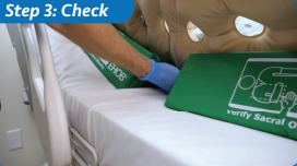 To check for proper inflation, slide your hand between the overlay and support surface, under the patient's sacral area. Your hand should slide easily beneath the patient and you should notice approximately 1/2 inch to 1 inch of air. If ther is more than 1 inch of air, remove air by tapping the clear valve. If your hand does not slide easily beneath the patient, add additional air.
