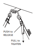 Pull the loose end of each restraint tight. To release, simply press the release tab and remove the hooks.