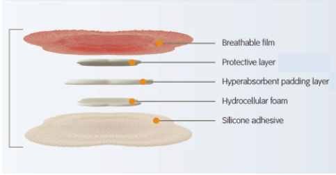 - Silicone wound contact layer minimizes trauma to the wound and pain to the patient during dressing changes while allowing the dressing to be repositoned